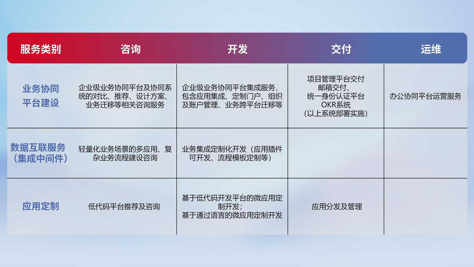 针对钉钉、、企微、、、、IDaas等平台级产品提供产品的规划、、、方案、、、、交付、、、、定制化开发等服务,,,,实现如统一协同办公、、、智能客户服务、、、、混合会议管理、、、、智能数据查询、、、、等业务场景,,,实现数字化转型。。。
