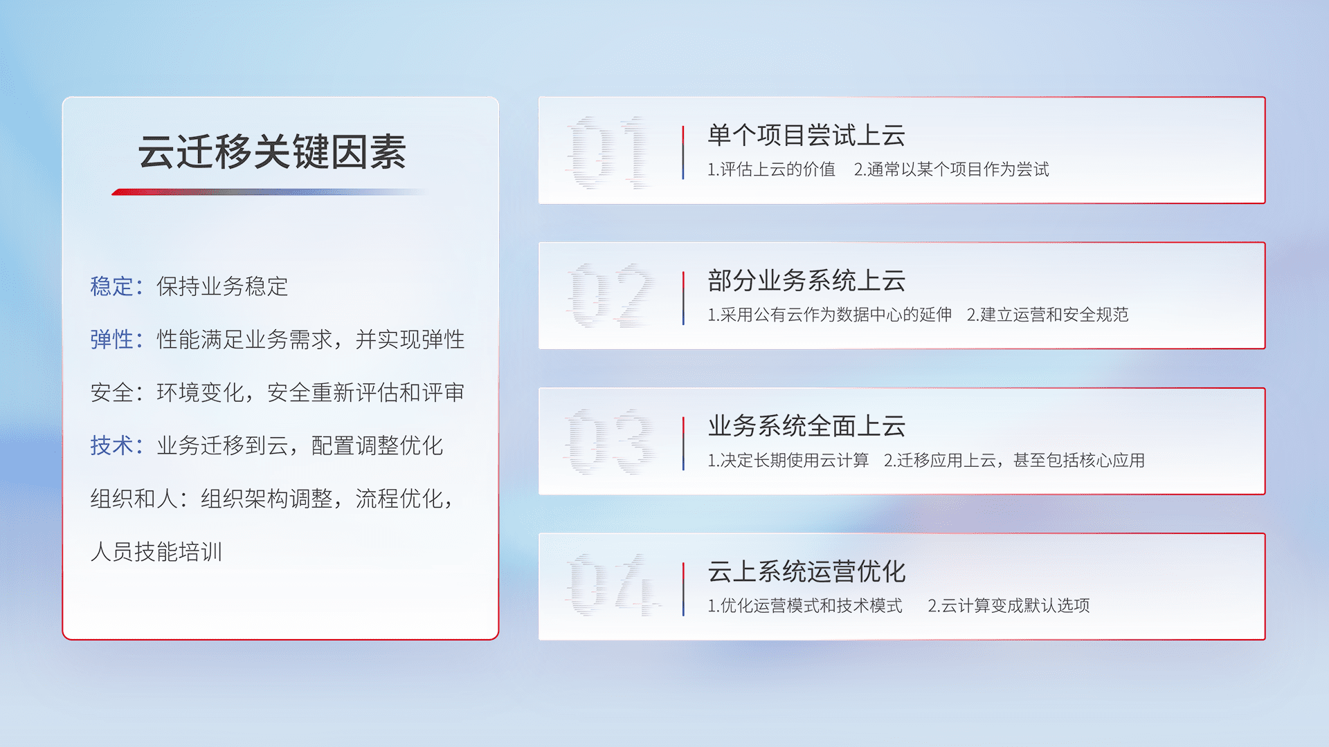 结合实际业务,,,,从规划设计、、、、云平台选型、、云原生改造、、数据迁移、、、集成交付,,,,迁移全过程为客户识别最佳上云路径,,,,做好风险识别管理,,,设计网络架构、、、、身份权限、、安全审计合规、、、操作审计、、、、日志审计、、、监控告警策略、、多站点容灾设计等,,,对云上基础设施进行整体规划,,提升IT治理水平,,以满足弹性、、、、高可用、、高性能的需求。。。。
