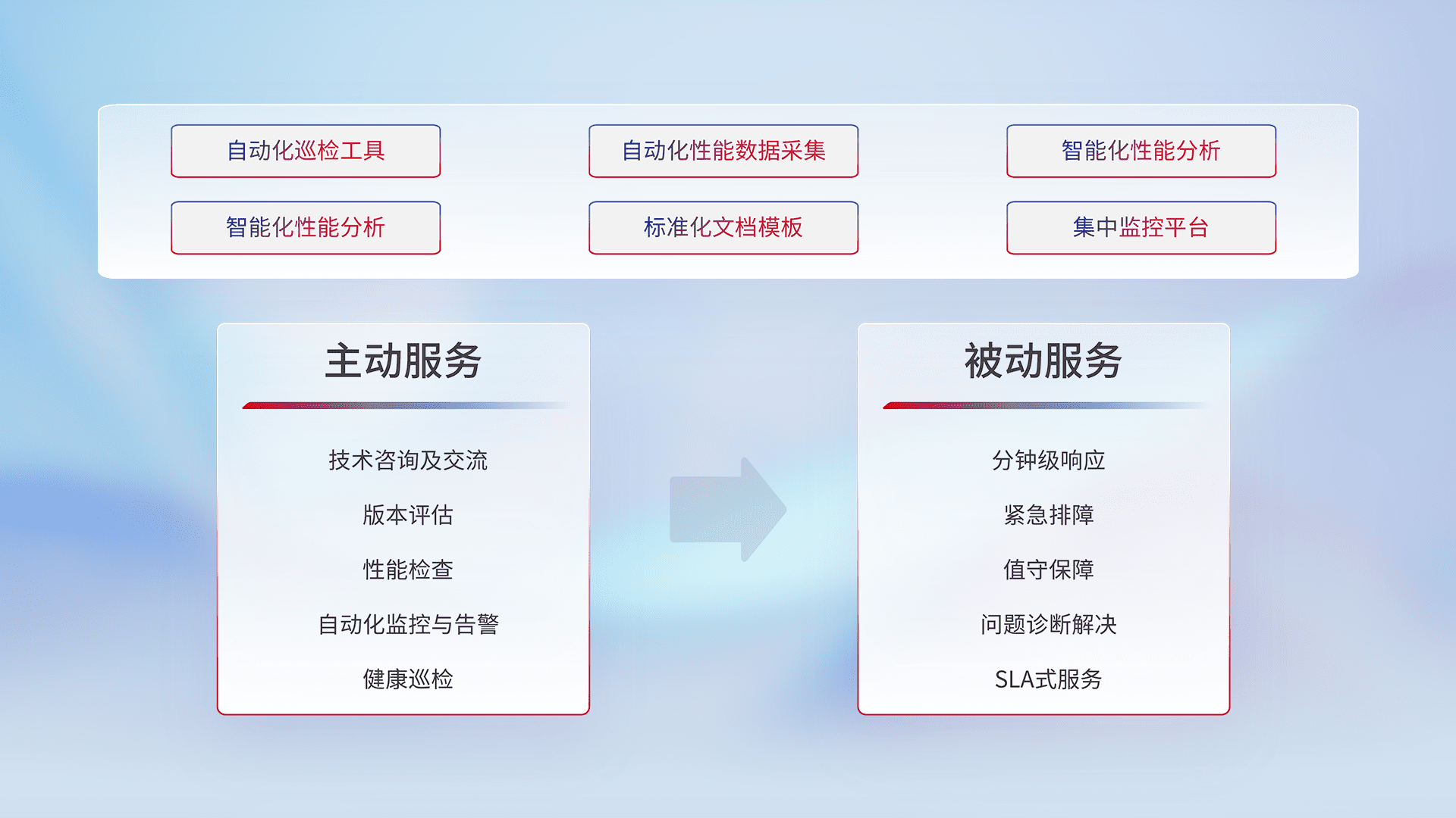 智能化工具和标准化文档,,保障服务质量,,提供主动服务(包含技术咨询、、、版本评估、、、、性能检查、、、自动化监控与告警、、、健康巡检)和被动服务包含(分钟级响应、、紧急排障、、、值守保障、、问题诊断解决、、、、SLA服务)。。。。